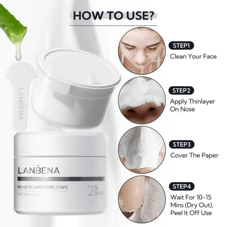 چسب بینی لانبنا کاسه ای دارای 60 عدد کاغذ مخصوص، از بین برنده جوش های سر سیاه و تخلیه کننده منافذ باز پوست است. این چسب که به قاتل جوش های سرسیاه معروف است، پوست را از جوش سر سیاه، موهای ریز و جوش های سر سفید پاکسازی کرده و منافذ را کوچک می کند. استفاده از این چسب پوست را شفاف و درخشان می کند.