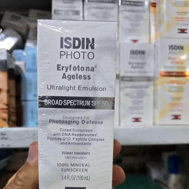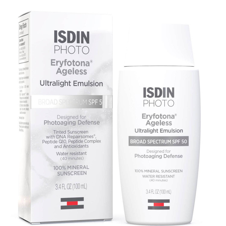 ضد آفتاب رنگی %100 مینرال SPF 50 ایزدین ISDIN Eryfotona Ageless ضد آفتاب رنگی %100 مینرال SPF 50 ایزدین ISDIN Eryfotona Ageless یک امولسیون فوق سبک رنگی با جذب سریع است. که به مبارزه با علائم پیری و آسیب های نور خورشید کمک می کند. فرمول نوآورانه آن بر پایه محافظت از پوست است. که به بازسازی و ترمیم پوست نیز کمک می کند. این کرم ضد آفتاب %100 معدنی SPF50 ، با ترکیبی نوآورانه از پپتیدها ، آنتی اکسیدان ها و DNA Repairsomes به ترمیم آسیب های رسیده در معرض نور خورشید و کاهش خطوط و چین و چروک روی پوست کمک می کند.