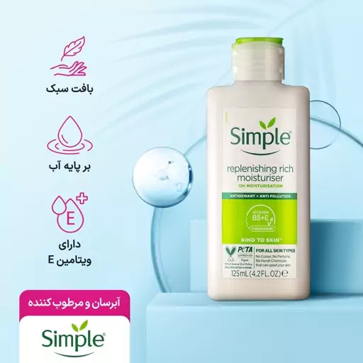 آبرسان ریچ سیمپل جزو پرفروشترین محصولات برند سیمپل است که برای پوست های خشک، خیلی خشک و حساس ایدهآل است. این مرطوب کننده ریچ سیمپل حاوی ترکیبات تغذیه و رطوبت رسان و سرشار از ویتامینها است که پوست شما را تا 24 ساعت آبرسانی کرده و از خشکی، دهیدراته شدن پوست و بروز چین و چروک های ناشی از خشکی جلوگیری میکند. ابرسان سیمپل ریچ، یک مرطوبکننده غنی از ویتامین است که پوست را نرم و مرطوب میکند. ویتامین پرو B5 موجود در ترکیبات کرم سیمپل ریچ پوست را رطوبت رسانی و تغذیه رسانی میکند؛ همچنین این محصول غیر کمدون زا است و باعث مسدود شدن منافذ و ایجاد حساسیت نمیشود. آبرسان سیمپل دارای بافتی سبک و زود جذب است و بدون ایجاد حس چربی و سنگینی پوست شما را نرم و لطیف کرده و شادابی و درخششی طبیعی به آن هدیه میدهد.